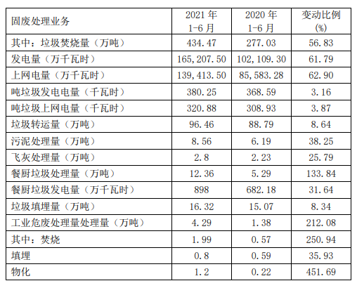 固廢業(yè)務主營業(yè)務收入增長的主要原因是報告期內新增生活垃圾焚燒發(fā)電項目處理規(guī)模共 5700 噸/日、部分有機廢棄物處理項目及南海工業(yè)危廢處理項目投產,環(huán)衛(wèi)業(yè)務、工程收入增加等,同時因加大業(yè)務拓展力度及信息化、智能化應用不斷加強,協(xié)同效應和產能利用率進一步提升,且去年上半年因疫情影響基數較低。