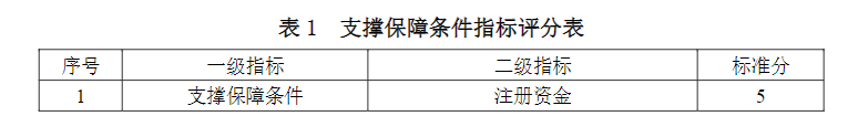 支撐保障條件指標(biāo)包括環(huán)境咨詢(環(huán)保管家)服務(wù)單位的注冊資金、上年度營業(yè)收入、員工數(shù)量、職稱、質(zhì)量管理體系以及業(yè)務(wù)培訓(xùn)6項(xiàng)二級指標(biāo)。支撐保障條件指標(biāo)評分見表1。