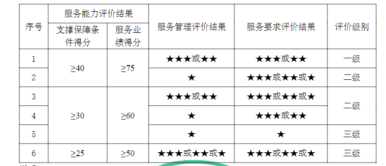 說明:1.支撐保障條件得分≥40,且服務(wù)業(yè)績得分≥75,只要服務(wù)管理評價結(jié)果或服務(wù)要求評價結(jié)果被評為★,則評價級別為二級。2.支撐保障條件得分≥30,且服務(wù)業(yè)績得分≥60,只要服務(wù)管理評價結(jié)果和服務(wù)要求評價結(jié)果同時被評為★,則評價級別為三級。