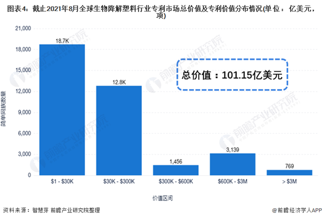 目前,全球生物降解塑料行業(yè)專利總價值為100.79億美元。其中,3萬美元以下的生物降解塑料專利申請數(shù)量最多,為18735項(xiàng);其次是3萬-30萬美元的生物降解塑料專利,合計(jì)專利申請量為12812項(xiàng)。3百萬美元以上的生物降解塑料專利申請數(shù)量最少,為769項(xiàng)。