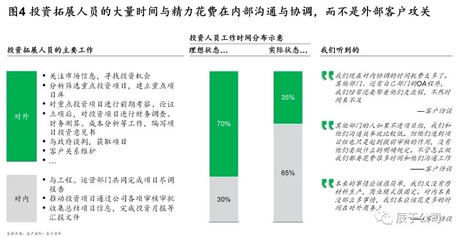 理想狀態(tài)下,對外對內工作的時間分配比例應該是7:3,甚至更高也不為過,但現(xiàn)實往往相反,由于內部協(xié)同效率不高、流程繁冗、“人治”問題嚴重,我們發(fā)現(xiàn)一些投資拓展人員更多的時間與精力花費在內部溝通與協(xié)調,而不是外部客戶攻關。造成這種現(xiàn)象的原因,表面看上去是內部流程繁瑣,決策鏈條冗長,實則是內部沒有形成一以貫之以市場為導向、以項目為核心的理念文化。平時大多只是喊喊口號而已,并未真正付諸行動。
