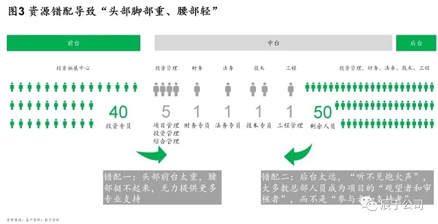 不難發(fā)現(xiàn),近年來一些企業(yè)開始“招兵買馬”,大量招聘投資拓展人員,這對于企業(yè)提高投資拓展能力自然是好事。不過我們也注意到,一些企業(yè)在投資相關的人員配置上卻不盡合理:他們通常把大量投資拓展人員“撒在前線”,同時建立“大后臺”,與投資相關的投管、財務、法務,甚至技術、工程、運營等人員主要負責項目質量把關和風險管控,只有少量人員在中臺為前臺提供支持。這種“頭重腳重”帶來兩個“錯配”,一是頭部前臺太重,腰部挺不起來,無力提供更多專業(yè)支持;二是腳部后臺太遠,“聽不見炮火聲”,大多數(shù)人成為項目的“觀望者和審核者”,而不是“參與者和支持者”。
