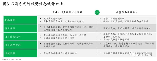 造成這一現(xiàn)象的原因,一是如前文所述,企業(yè)自身很多投資拓展條線的問題尚未厘清,上系統(tǒng)往往是無用功,解決不了實際問題;二是提供這類服務的專業(yè)公司很少,往往需要企業(yè)在通用軟件的基礎上進行二次開發(fā),成本較高且難度較大,導致很多企業(yè)望而卻步。
