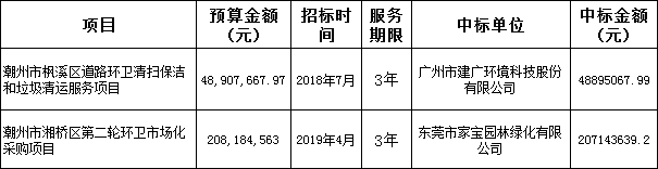 2019年4月份,潮州市湘橋區(qū)第二輪環(huán)衛(wèi)市場化采購項目公開招標(biāo),預(yù)算金額為208,184,563元,服務(wù)期為3年,最終,東莞市家寶園林綠化有限公司以207143639.19元的價格中標(biāo)。
