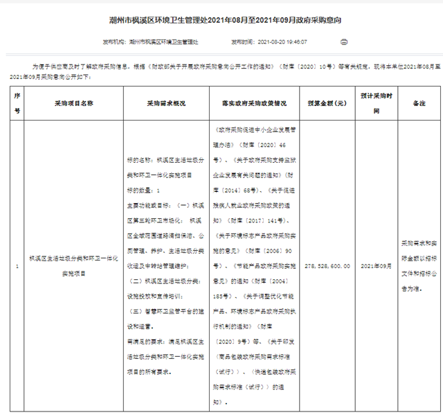 即將在9月份采購的湘橋區(qū)生活垃圾分類和環(huán)衛(wèi)一體化實施項目和楓溪區(qū)生活垃圾分類和環(huán)衛(wèi)一體化實施項目,總投資超10億元,這么高額的預(yù)算費(fèi)用用來用于潮州市環(huán)衛(wèi)一體化改革,充分說明了潮州市政府對環(huán)衛(wèi)一體化改革的重視程度之高,最終誰能奪得兩項目,中國固廢網(wǎng)將持續(xù)關(guān)注——
