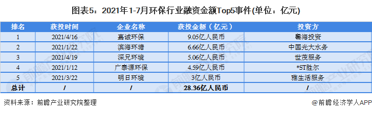2021年1-7月,環(huán)保行業(yè)Top5投融資事件共計28.36億元,其中獲投金額最多的主人翁為嘉誠環(huán)保,由粵海投資9.05億元。