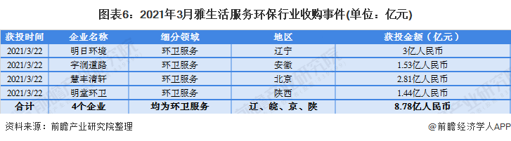 值得注意的是排名第五的投融資事件,由雅生活服務(wù)出資3億元收購明日環(huán)境。雅生活服務(wù)在同天斥8.78億人民幣收購了4家環(huán)衛(wèi)服務(wù)相關(guān)企業(yè),分別是明日環(huán)境、宇潤道路、慧豐清軒和明堂環(huán)衛(wèi)。