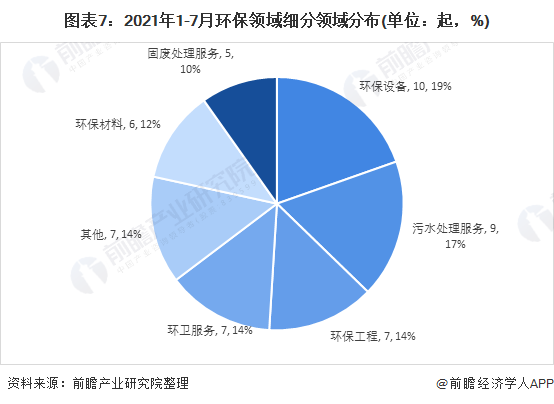 2021年1-7月,環(huán)保設(shè)備和污水處理服務(wù)領(lǐng)域分別發(fā)生10起和9起投融資事件,分別占總投融資事件總數(shù)的19%和17%;環(huán)衛(wèi)服務(wù)領(lǐng)域發(fā)生7起,占14%的比重。
