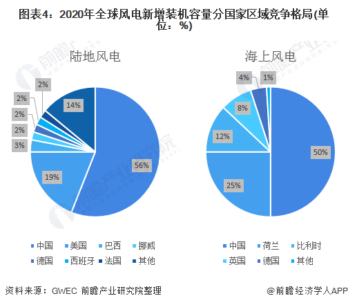 從2020年陸地風(fēng)電新增裝機(jī)容量分國(guó)家情況來(lái)看,中國(guó)新增裝機(jī)容量占比56%,排名第一,其次為美國(guó)占比19%。從海上風(fēng)電分國(guó)家情況來(lái)看,中國(guó)新增裝機(jī)容量占比50%,仍然排名第一;荷蘭和比利時(shí)占比分別為25%和12%,位列第二和第三。