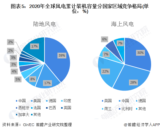 從2020年陸地風(fēng)電累計(jì)裝機(jī)容量分國(guó)家情況來(lái)看,中國(guó)累計(jì)裝機(jī)容量占比39%,排名第一,其次為美國(guó)占比17%。從海上風(fēng)電分國(guó)家情況來(lái)看,英國(guó)累計(jì)裝機(jī)容量占比29%,排名第一;中國(guó)和德國(guó)占比分別為28%和22%,位列第二和第三。