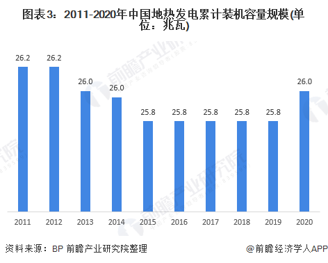 我國地?zé)崮荛_發(fā)利用處于起步階段有關(guān),關(guān)鍵技術(shù)有待突破。根據(jù)英國石油公司BP的數(shù)據(jù)顯示,2011-2019年,中國地?zé)岚l(fā)電累計(jì)裝機(jī)容量一直在25-27兆瓦區(qū)間內(nèi),近五年更是沒有出現(xiàn)過變動(dòng)。隨著我國“碳中和”和“碳達(dá)峰”目標(biāo)的確立,中國地?zé)岚l(fā)電裝機(jī)容量得到增長。