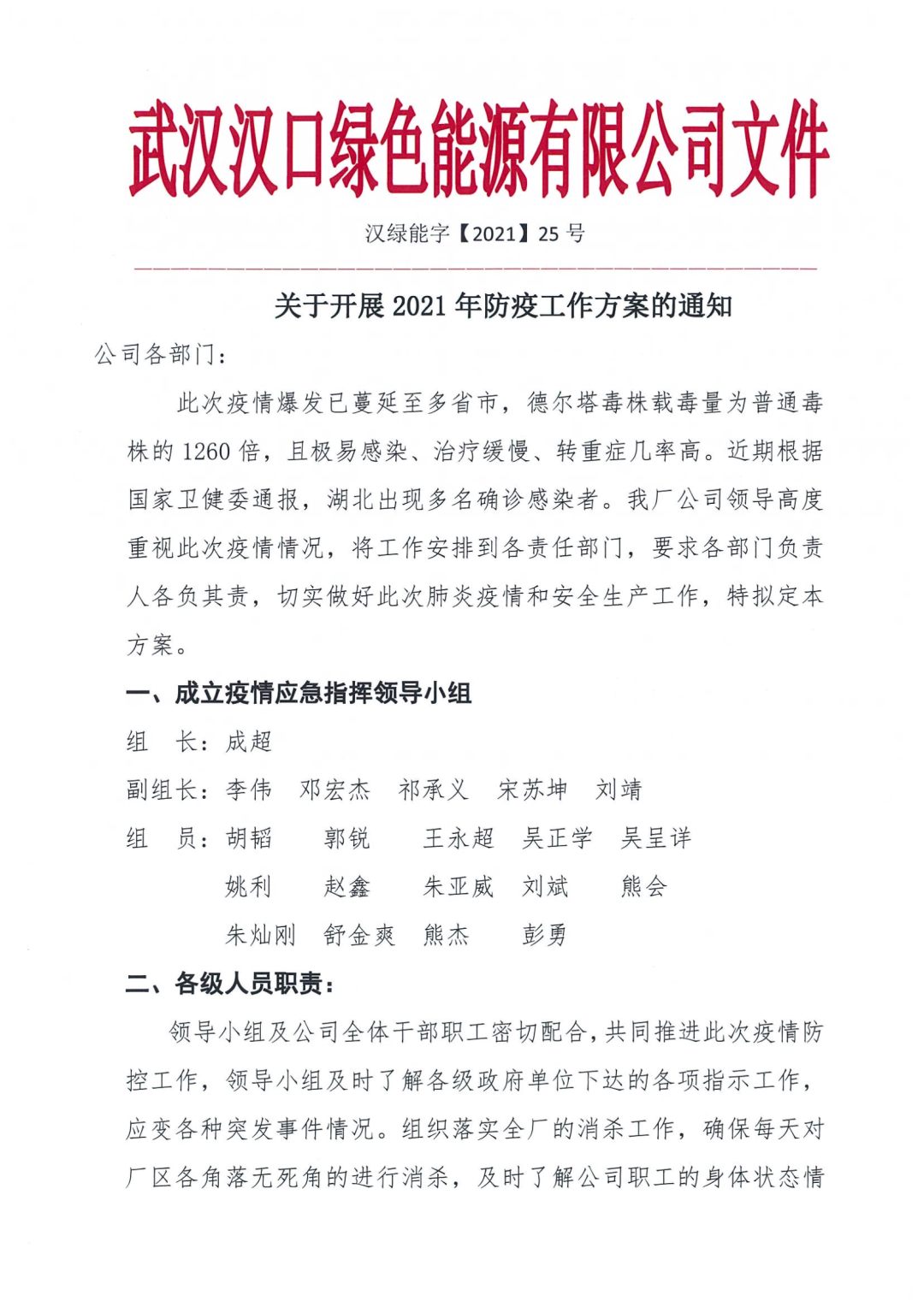 同日,漢口垃圾發(fā)電廠發(fā)布《關(guān)于開展2021年防疫工作方案的通知(漢綠能字【2021】25號)通知》,迅速成立電廠疫情應(yīng)急指揮小組,對各部門、各級人員疫情防控職責(zé)及防疫措施進(jìn)行了明確。