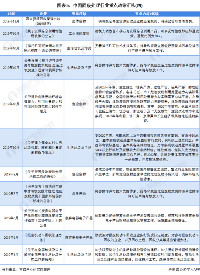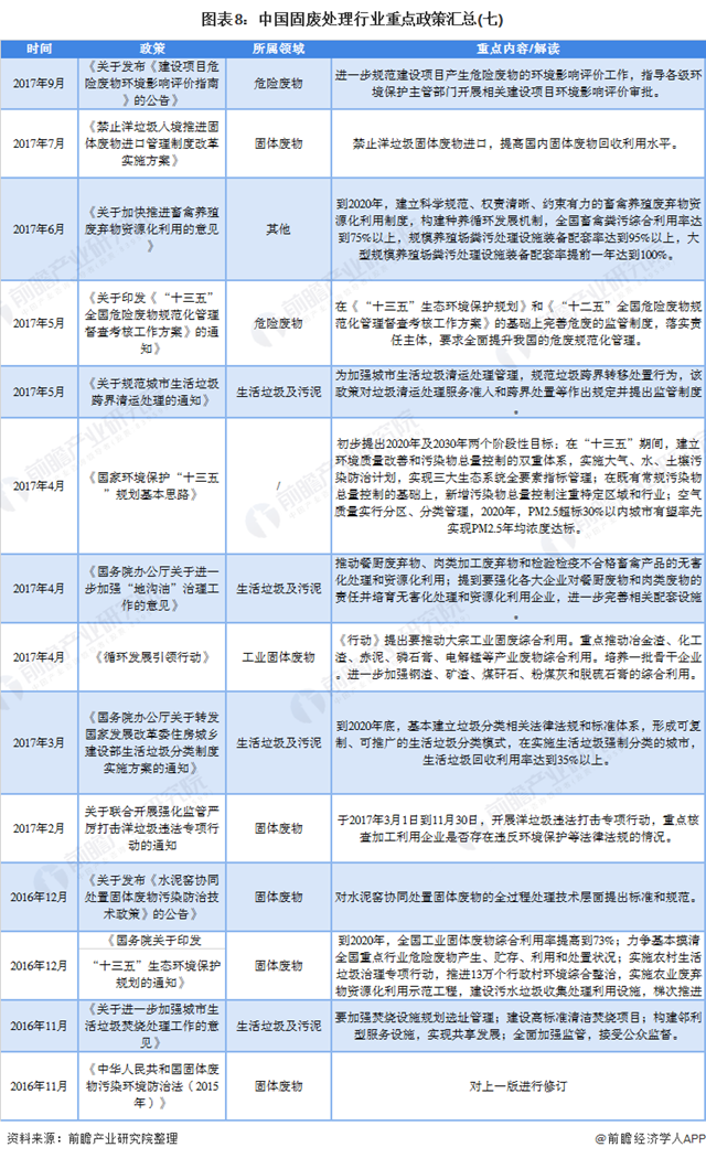 我國固廢行業(yè)相關(guān)的重點政策針對方面主要可分為綜合固體廢物、危險廢物、工業(yè)固體廢物、廢棄電器電子產(chǎn)品、生活垃圾及污泥及其他,在該基礎(chǔ)上,針對不同方面出臺了數(shù)量相當(dāng)?shù)恼咭砸?guī)定和支持固廢處理及其相關(guān)產(chǎn)業(yè)(例如,垃圾焚燒發(fā)電等)的產(chǎn)業(yè)化發(fā)展。