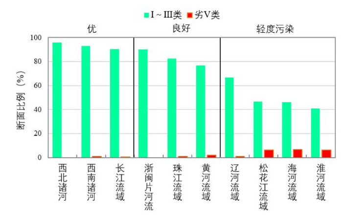 圖4 1-7月七大流域和西南、西北諸河及浙閩片河流水質(zhì)類別比例