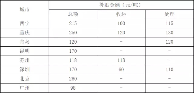 我國(guó)部分城市餐廚運(yùn)營(yíng)補(bǔ)貼