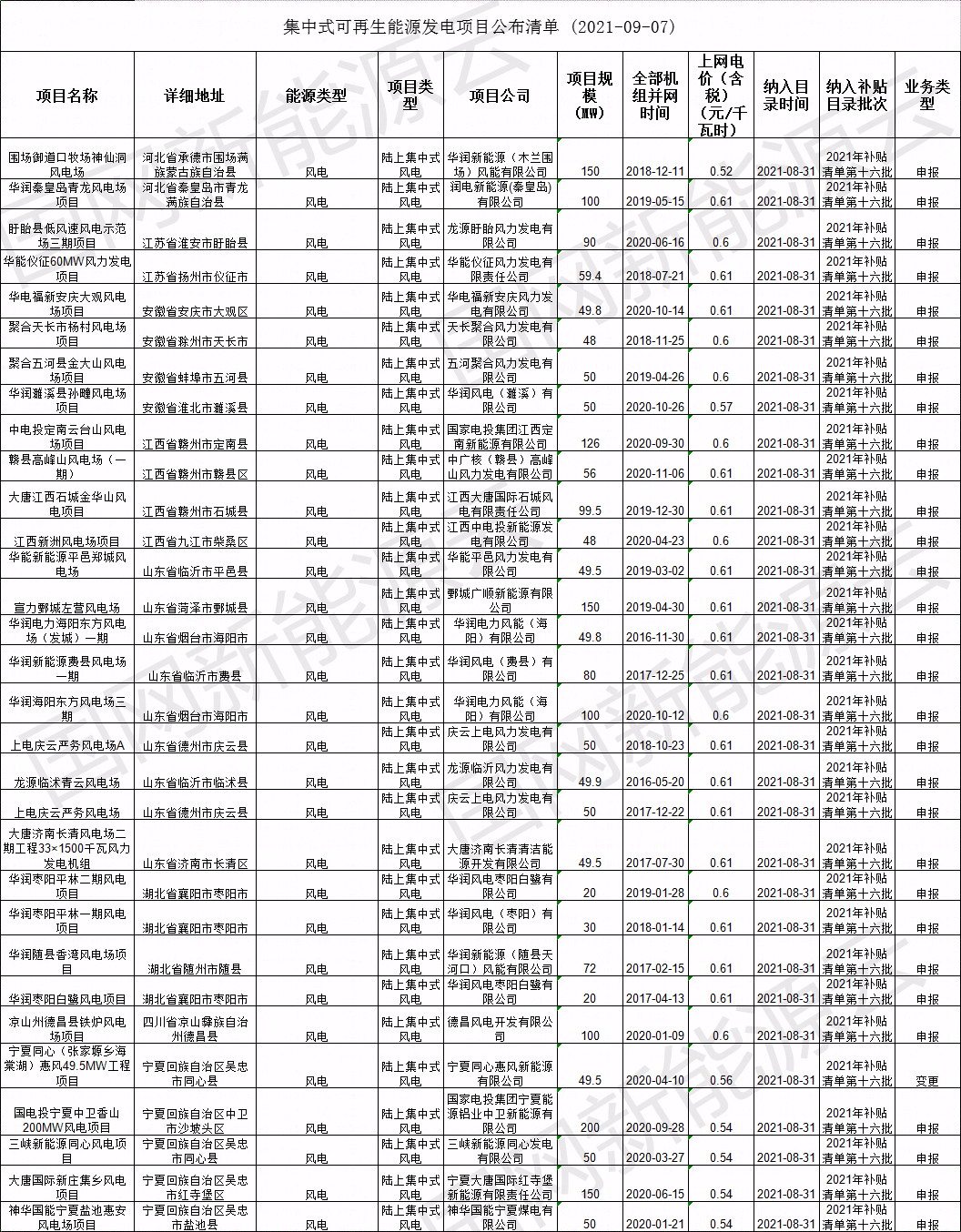 2021年8月31日,我公司已將完成公示的2021年第十六批可再生能源發(fā)電項目補貼項目清單上報國家主管部門,現(xiàn)將十六批可再生能源發(fā)電并網(wǎng)項目清單詳情盤點如下:
