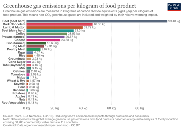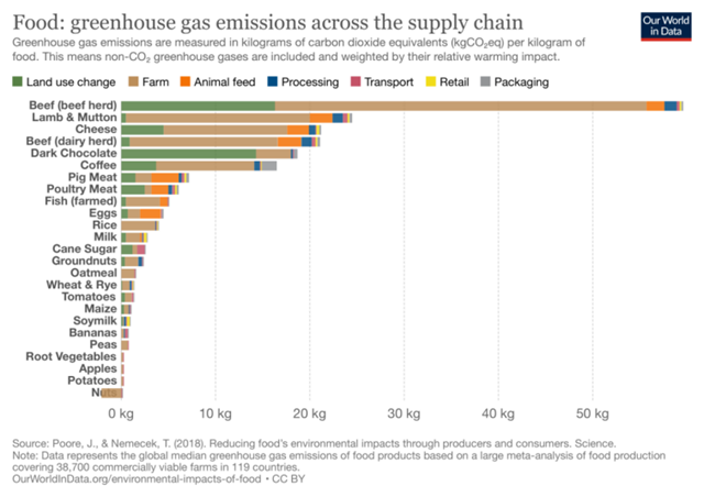 據(jù)牛津大學(xué)開發(fā)的Our World in Data平臺(tái)中,我們從中選取了一些中國(guó)人經(jīng)常食用的食品種類,統(tǒng)計(jì)后得出下圖,位于圖表底部的多是水果與植物性食物,它們的碳排放普遍偏低,比動(dòng)物性食物低10至50倍。其次是糖,牛奶,雞蛋,家禽等。碳排放較高的是黑巧克力,咖啡以及肉類。由下往上最終我們看到,位列碳排放之首的是牛肉,遠(yuǎn)遠(yuǎn)超出其它各項(xiàng)食品。可以看出,那些經(jīng)過最少加工且對(duì)人體健康益處大的食物通常對(duì)環(huán)境的危害也很小,比如谷物,水果,蔬菜,豆類,堅(jiān)果,橄欖油等食品。相反,紅肉等具有高疾病風(fēng)險(xiǎn)的食物對(duì)環(huán)境影響也是最大的。同樣的,加工過程復(fù)雜的一些食品比如咖啡和巧克力等則對(duì)健康有害的同時(shí)也會(huì)對(duì)環(huán)境造成不良影響。由此可見,飲食健康也意味著可持續(xù)健康。(圖3)