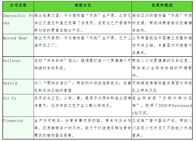 在企業(yè)產(chǎn)品管理方面,企業(yè)通過打造“未來膳食”理念,改變?nèi)藗兊膫鹘y(tǒng)飲食結(jié)構(gòu),通過現(xiàn)代化的食品生產(chǎn)系統(tǒng),如“人造肉”降低食品生產(chǎn)階段的碳排放。例如Beyond Meat公司,計(jì)劃在中國(guó)建立完整的植物肉供應(yīng)鏈,豐富國(guó)內(nèi)肉類替代品美食。除此以外,Unilever啟動(dòng)“未來食物”倡議,強(qiáng)調(diào)要打造一個(gè)更健康的可持續(xù)的食物系統(tǒng),幫助人們向更健康的飲食過渡,幫助減少全球食物鏈的環(huán)境影響。雖然利用現(xiàn)在的食品生產(chǎn)技術(shù)可以實(shí)現(xiàn)“人造蛋白”等低碳替代食品規(guī)模生產(chǎn),但其是否能被傳統(tǒng)消費(fèi)者廣泛接受仍然需要證實(shí)。