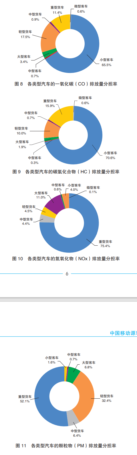 從車型上來(lái)看,4項(xiàng)污染物排放分擔(dān)率,一氧化碳(CO)、碳?xì)浠衔?HC)占比最大的均為小型客車,分別達(dá)到65.5%、70.6%;氮氧化物(NOx)、顆粒物(PM)占比最大的則為重型貨車,達(dá)到75.4%和52.1%。