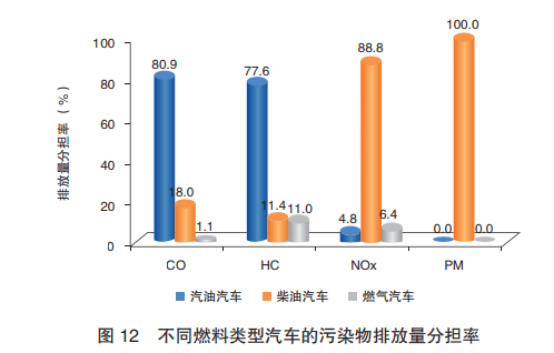 從燃料類型上看,4項(xiàng)污染物排放分擔(dān)率,一氧化碳(CO)、碳?xì)浠衔?HC)占比最大的為汽油汽車;氮氧化物(NOx)、顆粒物(PM)則為柴油汽車。其中,柴油類汽車在PM排放分擔(dān)率上達(dá)到100%。