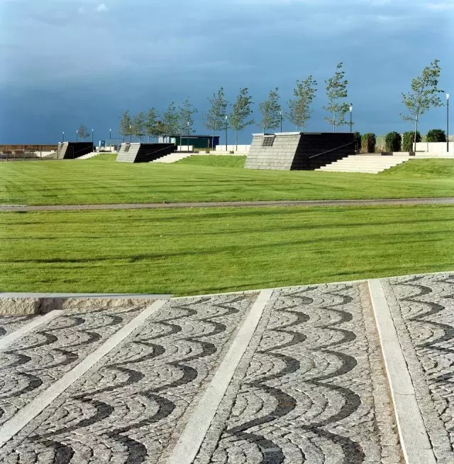 Dania濱海公園位于瑞典和丹麥分界處的?resund海峽一側。該公園是原馬爾默海岸西部港口改造工程的主要項目之一,也是瑞典國內對城市用地進行開發(fā)再利用的最為雄心勃勃的項目之一。該用地曾經(jīng)是寸草不生的垃圾填埋場;是一片充斥著臟污不堪的淤泥的工業(yè)荒漠。起初,難以定義的基地條件給設計師帶來了不小的困難,最終那些自然的瞬息萬變的元素反而構成了設計的主角:光、風、大海、地面線以及一望無際的遠景。這是一片隨季節(jié)和氣候變化的場所,人們在這里可以體驗巖石的堅硬與海浪的兇悍,體驗落日的壯美與夏日的明媚。公園最重要的組成要素是被稱為“Scouts(瞭望臺)”的部分:三個傾斜的混凝土臺,嵌入到巖石組成的海岸線中,讓來到公園的人們可以深入大海。40X40m的被稱為“堡壘”的平臺,比海平面高6m,無論是強烈的海風還是壯美的落日,只要站在這里都能暢快地體驗。此外,三個木箱組成的“陽臺”提供了俯瞰廣闊草坪的場所。后者是一塊絕佳的室外活動場地,兩排高地錯落的樹木及耐鹽灌木將強烈的海風阻隔在外。
