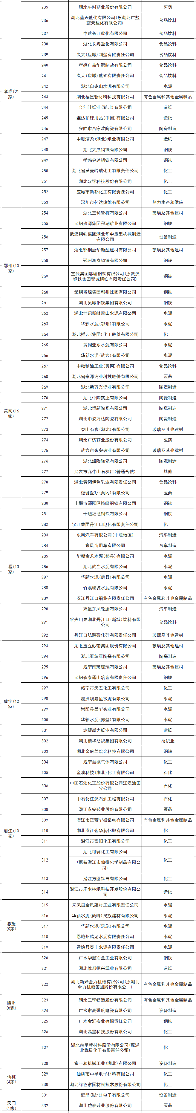 湖北省2020年度納入碳排放配額管理企業(yè)清單(332家)
