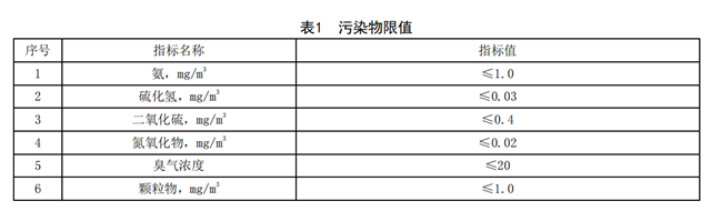 7.4 氨、硫化氫、二氧化硫、氮氧化物和臭氣濃度等惡臭污染物廠界排放限值應(yīng)符合GB 14554中惡臭污染物廠界標(biāo)準(zhǔn)相應(yīng)級別的指標(biāo)值。顆粒物應(yīng)符合GB 3095-2012表1中二級濃度限值要求。具體要求見表1。