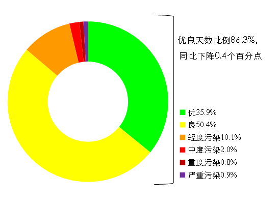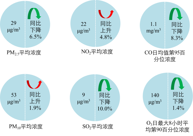 1-8月,全國(guó)339個(gè)地級(jí)及以上城市平均優(yōu)良天數(shù)比例為86.3%,同比下降0.4個(gè)百分點(diǎn);PM2.5平均濃度為29微克/立方米,同比下降6.5%;PM10平均濃度為53微克/立方米,同比上升1.9%;O3平均濃度為140微克/立方米,同比下降1.4%;SO2平均濃度為9微克/立方米,同比下降10.0%;NO2平均濃度為22微克/立方米,同比上升4.8%;CO平均濃度為1.1毫克/立方米,同比下降8.3%。