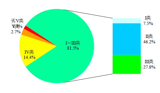1-8月,3641個(gè)國(guó)家地表水考核斷面中,水質(zhì)優(yōu)良(Ⅰ~Ⅲ類)斷面比例為81.5%,同比上升0.9個(gè)百分點(diǎn);劣Ⅴ類斷面比例為1.4%,同比下降0.9個(gè)百分點(diǎn)。主要污染指標(biāo)為化學(xué)需氧量、高錳酸鹽指數(shù)和總磷。
