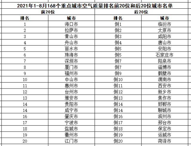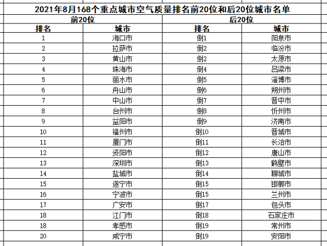 8月,168個(gè)重點(diǎn)城市中,???、拉薩和黃山市等20個(gè)城市空氣質(zhì)量相對(duì)較好(從第1名至第20名);陽(yáng)泉、臨汾和太原市等20個(gè)城市空氣質(zhì)量相對(duì)較差(從倒數(shù)第1名至并列倒數(shù)第19名),見(jiàn)附表3。