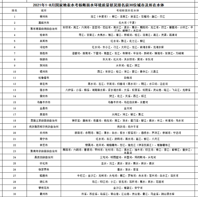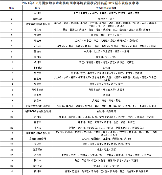 1-8月,全國(guó)地級(jí)及以上城市中,柳州、嘉峪關(guān)和黔東南州等30個(gè)城市國(guó)家地表水考核斷面水環(huán)境質(zhì)量相對(duì)較好(從第1名至第30名),烏蘭察布、赤峰和呂梁市等30個(gè)城市國(guó)家地表水考核斷面水環(huán)境質(zhì)量相對(duì)較差(從倒數(shù)第1名至倒數(shù)第30名)。見(jiàn)附表1和附表2。