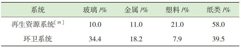 可回收物回收不充分—強(qiáng)化可回收物的兜底回收可回收物理論上包括各類(lèi)可以回收利用的組分,一些組分具有較高的市場(chǎng)售價(jià),往往進(jìn)入再生資源系統(tǒng)。而另一些組分可以回收但市場(chǎng)價(jià)格較低,需要環(huán)衛(wèi)系統(tǒng)進(jìn)行兜底回收。表 3為進(jìn)入再生資源系統(tǒng)和環(huán)衛(wèi)系統(tǒng)的玻金塑紙的比例,可以看出環(huán)衛(wèi)系統(tǒng)回收的玻璃等低值可回收物的數(shù)量要明顯高于再生資源系統(tǒng),而紙類(lèi)和塑料則相反。“兩網(wǎng)”融合與規(guī)范回收是許多城市垃圾分類(lèi)工作的重點(diǎn),一方面推動(dòng)管理機(jī)制融合,另一方面加快回收設(shè)施的融合和數(shù)據(jù)的共享。