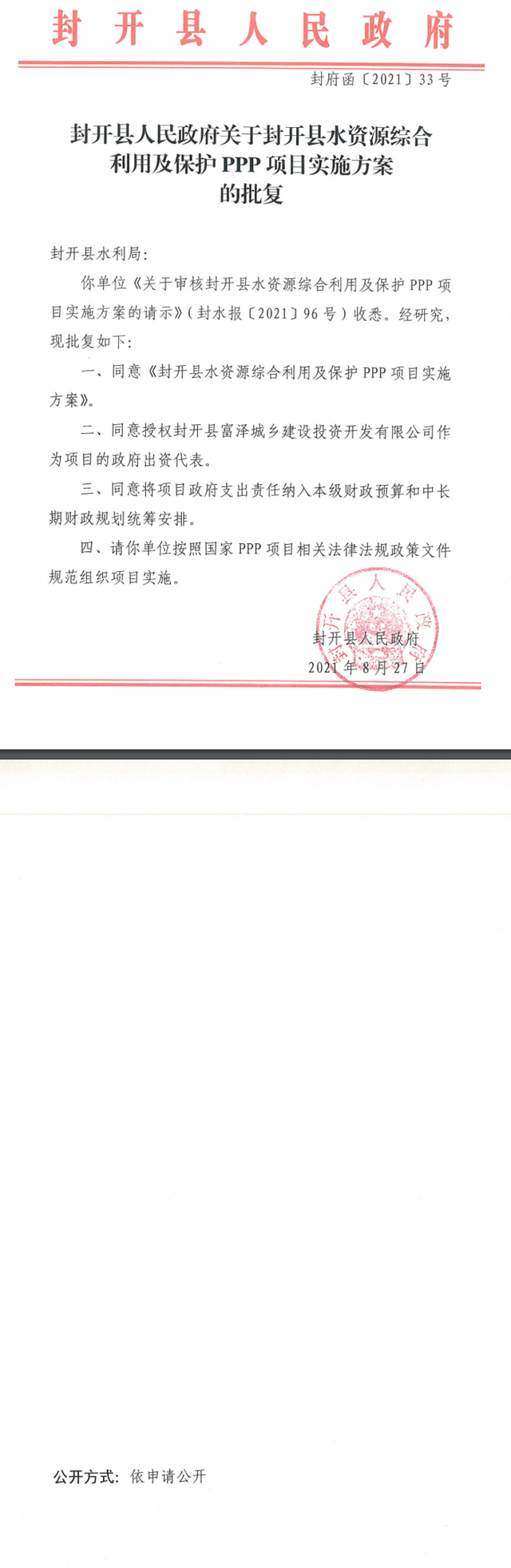 3、封開縣人民政府關(guān)于封開縣水資源綜合利用及保護(hù)PPP項(xiàng)目實(shí)施方案的批復(fù)(1)