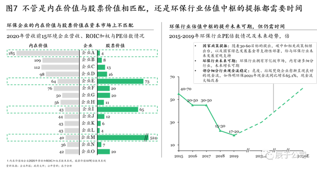 但必須承認的是,向好趨勢的背后,我國資本市場的制度完善仍需時間。首先是生態(tài)環(huán)保企業(yè)內(nèi)在價值與股票價值的相匹配需要時間,在對生態(tài)環(huán)保企業(yè)2020年營收前15強的營收、ROIC加權(quán)和PE倍數(shù)進行分析得到,多數(shù)企業(yè)(如企業(yè)A、E、I、M)的內(nèi)在價值與股票價值在資本市場上并不匹配。其次是生態(tài)環(huán)保估值中樞的提升仍需時日,盡管隨著國家政策的提振、生態(tài)環(huán)保行業(yè)的發(fā)展、部分細分行業(yè)企業(yè)現(xiàn)金流狀況的改善,環(huán)保估值中樞提升未來可期,但也并不是一蹴而就的(見圖7)。