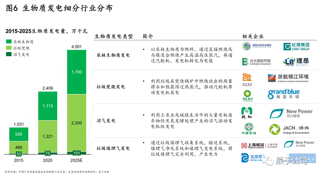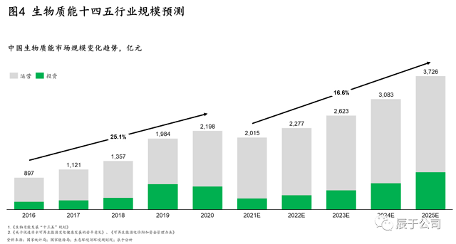 辰于預(yù)測(cè),隨著“30·60”雙碳目標(biāo)引導(dǎo)下的能源革命和能源轉(zhuǎn)型,以及相關(guān)政策支持(例如明確對(duì)存量、增量的生物質(zhì)發(fā)電項(xiàng)目將按照新增不欠的原則由國(guó)家繼續(xù)給予電價(jià)補(bǔ)貼,并鼓勵(lì)金融機(jī)構(gòu)按照市場(chǎng)化原則對(duì)列入補(bǔ)助項(xiàng)目清單的企業(yè)予以支持),生物質(zhì)能市場(chǎng)“十四五”期間的投資和運(yùn)營(yíng)規(guī)模將持續(xù)提升,復(fù)合增長(zhǎng)率16.6%,到2025年達(dá)到3700億元規(guī)模(見(jiàn)圖4)。投資方面,預(yù)計(jì)生物天然氣投資額最高,增長(zhǎng)也最快;運(yùn)營(yíng)方面,生物質(zhì)發(fā)電占比最高,但生物天然氣的增速最快。