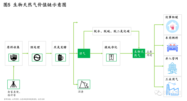 生物天然氣是指通過(guò)對(duì)秸稈、人畜糞便等生物質(zhì)經(jīng)過(guò)發(fā)酵形成沼氣后,進(jìn)一步提純獲得的天然氣,作為天然氣的替代品用于家庭炊事取暖、車(chē)用燃料、工業(yè)用氣等領(lǐng)域,它的價(jià)值鏈較長(zhǎng)(見(jiàn)圖5)。
