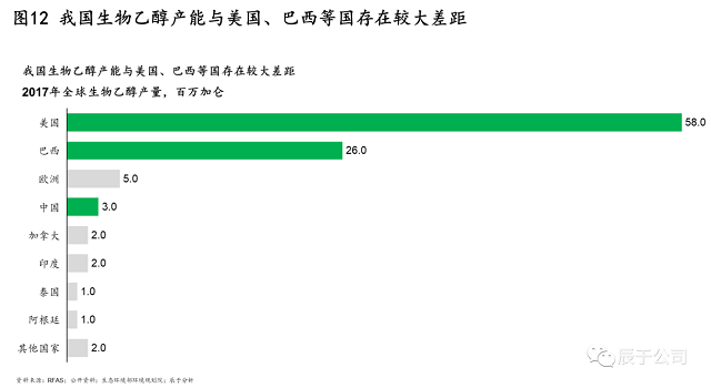 我國(guó)發(fā)展生物乙醇的總思路是“核準(zhǔn)生產(chǎn)、定向流通、封閉運(yùn)行、有序發(fā)展”,生物乙醇的生產(chǎn)、流通、銷(xiāo)售等都在嚴(yán)格限制范圍內(nèi)進(jìn)行,目標(biāo)到2025年達(dá)到688萬(wàn)噸產(chǎn)量(2020年400萬(wàn)噸)。但這一數(shù)字與美國(guó)、巴西等國(guó)家相比差距較遠(yuǎn),2017年全球生物乙醇產(chǎn)量中,中國(guó)的產(chǎn)量只有美國(guó)的二十分之一(見(jiàn)圖12)。