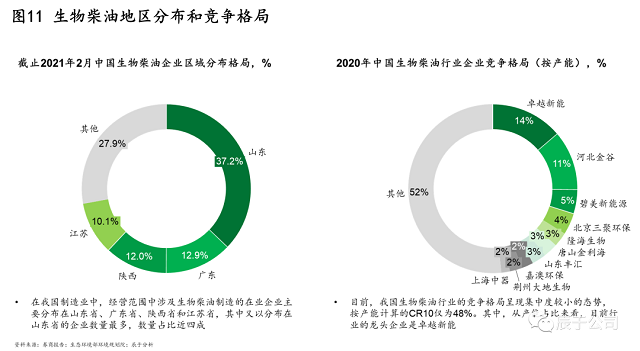 在銷(xiāo)售應(yīng)用上,國(guó)內(nèi)的主要渠道是出口、交通燃料、化工等,出口是拉動(dòng)行業(yè)發(fā)展的主要渠道,2019年出口占產(chǎn)量的比例達(dá)到80%。國(guó)內(nèi)需求的打開(kāi)是行業(yè)發(fā)展的最大希冀,其中最有望打開(kāi)的市場(chǎng)是交通燃料領(lǐng)域——生物柴油強(qiáng)制添加政策。部分城市已經(jīng)開(kāi)始在試點(diǎn),上海市2013年開(kāi)始在公交車(chē)上實(shí)行B5標(biāo)準(zhǔn)(添加比例5%)?,F(xiàn)在國(guó)家已開(kāi)始全國(guó)范圍進(jìn)行B5 強(qiáng)制添加標(biāo)準(zhǔn)的意見(jiàn)征求,并有望隨著雙碳目標(biāo)深入推進(jìn)提升到B10。若政策落地實(shí)施,將產(chǎn)生450萬(wàn)噸~1000萬(wàn)噸的產(chǎn)能缺口。