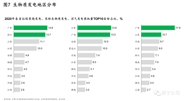 在地區(qū)分布上,各類型的生物質(zhì)發(fā)電集中于華東華南地區(qū),但各地區(qū)側(cè)重點(diǎn)有所不同。截至2020年底,垃圾焚燒發(fā)電集中在廣東省、浙江省、山東省、江蘇省、安徽省等地區(qū),合計(jì)占全國(guó)累計(jì)裝機(jī)容量的54%;農(nóng)林生物質(zhì)發(fā)電主要集中于山東省、湖北省、安徽省、黑龍江省、河南省,合計(jì)占比達(dá)到55.3%;沼氣發(fā)電主要集中于廣東省、山東省、河南省、江蘇省、浙江省,合計(jì)占比達(dá)到54.3%(見(jiàn)圖7)。