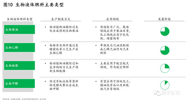 生物液體燃料是指把生物質(zhì)經(jīng)過(guò)發(fā)酵提純或者生化合成的方式制造成乙醇或油類等液體燃料,目前主要包括生物柴油、生物乙醇、生物航煤、生物甲醇等類型,生產(chǎn)制造方式各異,其中生物柴油、生物乙醇發(fā)展較為成熟(圖10)。