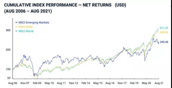 圖1 MSCI新興市場(chǎng)指數(shù)累積指數(shù)表現(xiàn)-凈回報(bào)(美元)(2006.8-2021.8)