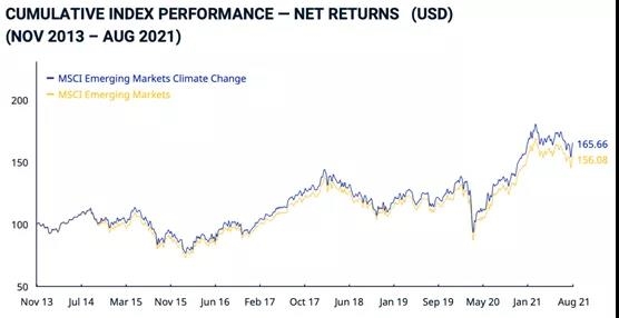 圖2 MSCI新興市場(chǎng)指數(shù)氣候變化累積指數(shù)表現(xiàn)-凈回報(bào)(美元)(2013.11-2021.8)