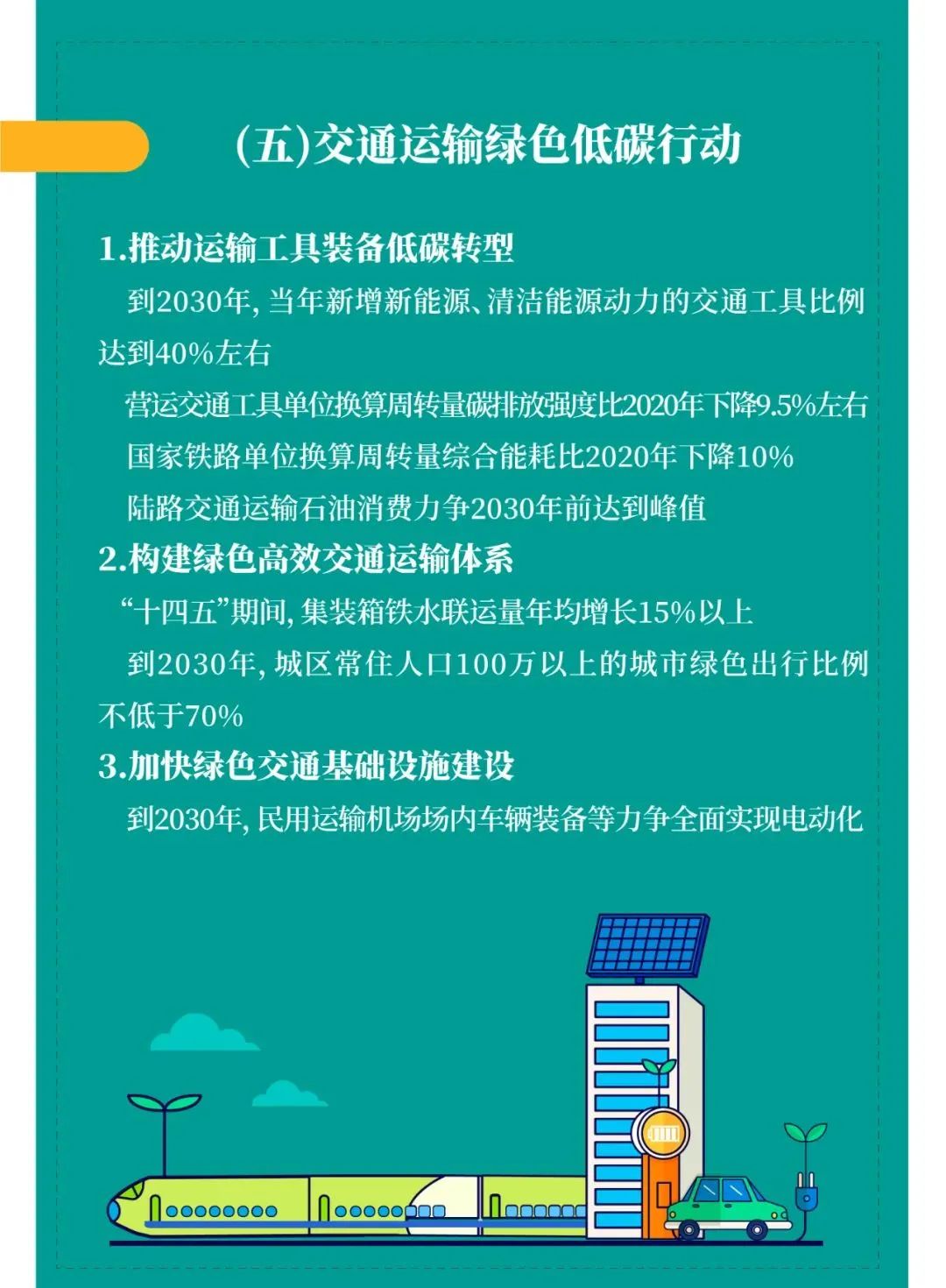 2.構(gòu)建綠色高效交通運輸體系。發(fā)展智能交通,推動不同運輸方式合理分工、有效銜接,降低空載率和不合理客貨運周轉(zhuǎn)量。大力發(fā)展以鐵路、水路為骨干的多式聯(lián)運,推進工礦企業(yè)、港口、物流園區(qū)等鐵路專用線建設(shè),加快內(nèi)河高等級航道網(wǎng)建設(shè),加快大宗貨物和中長距離貨物運輸“公轉(zhuǎn)鐵”、“公轉(zhuǎn)水”。加快先進適用技術(shù)應(yīng)用,提升民航運行管理效率,引導(dǎo)航空企業(yè)加強智慧運行,實現(xiàn)系統(tǒng)化節(jié)能降碳。加快城鄉(xiāng)物流配送體系建設(shè),創(chuàng)新綠色低碳、集約高效的配送模式。打造高效銜接、快捷舒適的公共交通服務(wù)體系,積極引導(dǎo)公眾選擇綠色低碳交通方式?!笆奈濉逼陂g,集裝箱鐵水聯(lián)運量年均增長15%以上。到2030年,城區(qū)常住人口100萬以上的城市綠色出行比例不低于70%。