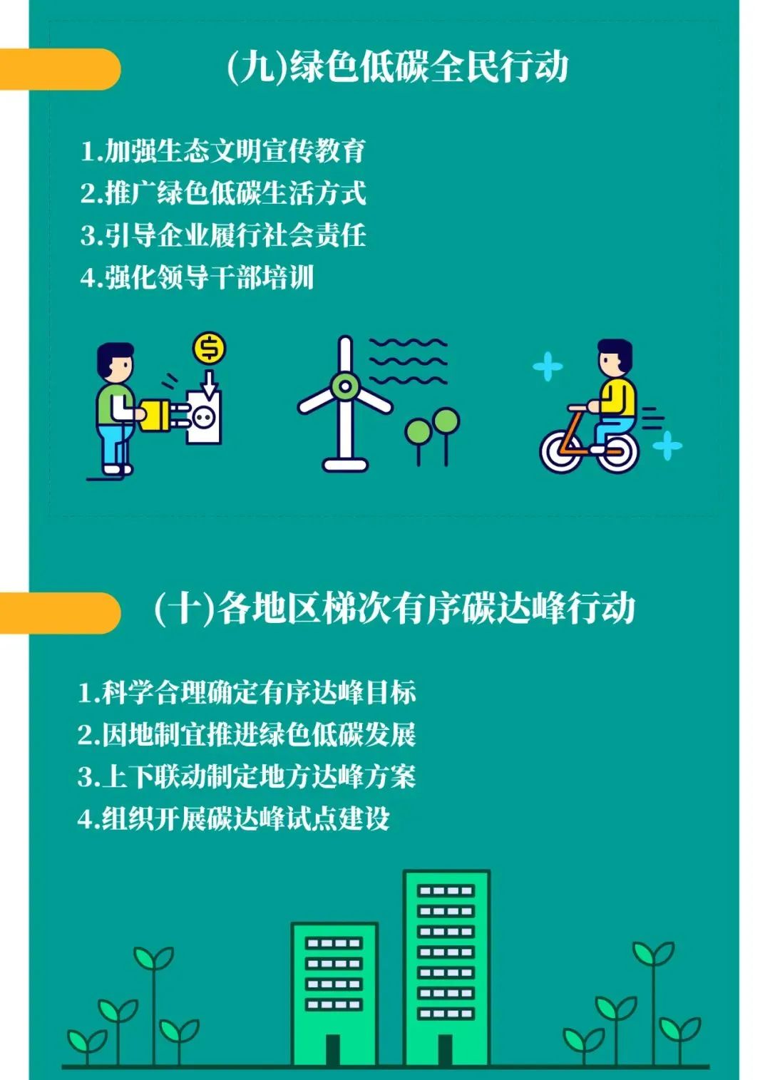 將碳達峰貫穿于經(jīng)濟社會發(fā)展全過程和各方面,重點實施能源綠色低碳轉(zhuǎn)型行動、節(jié)能降碳增效行動、工業(yè)領(lǐng)域碳達峰行動、城鄉(xiāng)建設(shè)碳達峰行動、交通運輸綠色低碳行動、循環(huán)經(jīng)濟助力降碳行動、綠色低碳科技創(chuàng)新行動、碳匯能力鞏固提升行動、綠色低碳全民行動、各地區(qū)梯次有序碳達峰行動等“碳達峰十大行動”。