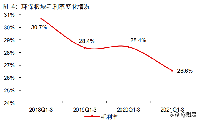 大氣:-6.8%,工程業(yè)務(wù)為主,受原材料價(jià)格上漲影響;頭部公司龍凈環(huán)保表現(xiàn)相對(duì)穩(wěn)健,近兩年復(fù)合增速為11.5%;奧福環(huán)保表現(xiàn)出成長性,近兩年復(fù)合增速為24.7%。監(jiān)測:-24.3%,行業(yè)整體需求欠佳,2021年有一定分化,雪迪龍歸母凈利潤同比 增 160%。水(工程設(shè)備):-33.1%,受原材料價(jià)格上漲影響,毛利率下行顯著。分析單季度數(shù)據(jù)時(shí),從樣本中剔除2019Q1數(shù)據(jù)不全的標(biāo)的,則:2021Q3單季度實(shí)現(xiàn)營業(yè)收入781億元,同比增11.6%;歸母凈利潤78.4億元,同比降0.37%;扣非歸母凈利潤72.8億元,同比增2.6%,Q3 單季度增速較低,主因去年上半年受疫情影響較重,部分訂單挪至Q3執(zhí)行,致去年Q3為高基數(shù),特別是工程業(yè)務(wù)、服務(wù)業(yè)務(wù)為主的方向;且原材料成本上行對(duì)利潤負(fù)面影響較大,整體毛利率下降2.22pct致26.7%。卓越新能在Q3歸母凈利潤基數(shù)較大的情況下,實(shí)現(xiàn)同比增速100.6%。