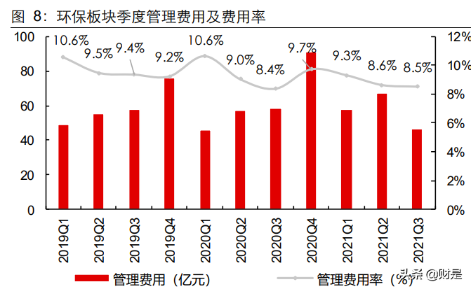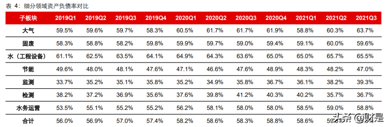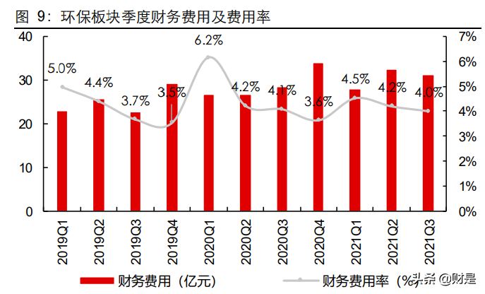 費(fèi)用端得到控制:2021Q1-Q3環(huán)保板塊期間費(fèi)用累計(jì)支出為361.8億元,同比增14.6%, 期間費(fèi)用率同比降1.2pct至15.7%。費(fèi)用率方面,銷售費(fèi)用率 2.8%,同比降0.41pct;管理費(fèi)用(含研發(fā)費(fèi)用,下同)率8.8%,同比降 0.37pct;財(cái)務(wù)費(fèi)用率4.1%,同比降0.41pct。期間費(fèi)用率同比下行的主要原因是:疫情后,收入同比大幅增長23.3%,致期間費(fèi)用率顯著下行。2021Q1-Q3期間費(fèi)用增速分別為:檢測同比增31.3%,期間費(fèi)用率同比降 1.1pct至33.6%;水務(wù)運(yùn)營同比增20.4%,期間費(fèi)用率同比降1.1pct至14.7%;監(jiān)測同比增17.8%,期間費(fèi)用率同比增4.8pct至42.5%;固廢同比增15.0%,期間費(fèi)用率同比降0.55pct至11.8%;大氣同比增10.3%,期間費(fèi)用率同比降 0.88pct至14.4%;水(工程設(shè)備)同比增9.6%,期間費(fèi)用率同比降 4.0pct 至 20.5%;節(jié)能同比增2.4%,期間費(fèi)用率同比降2.2pct 至 13.8%。