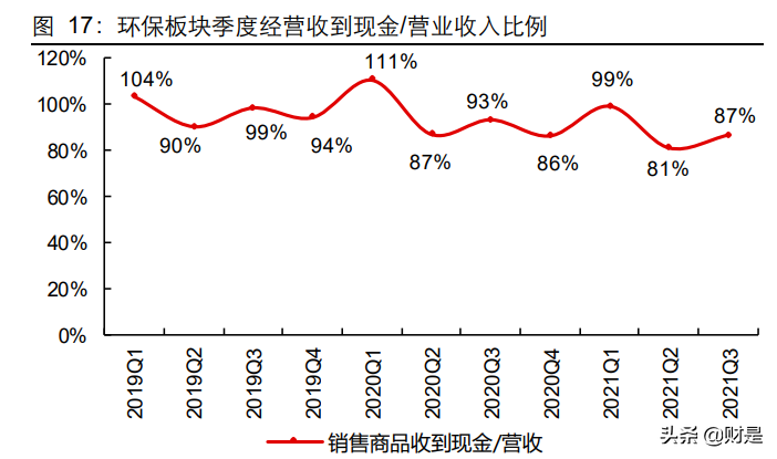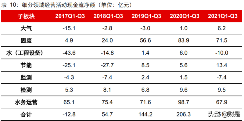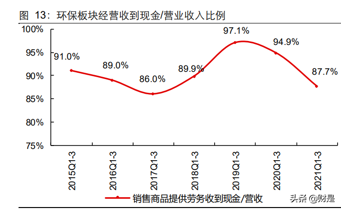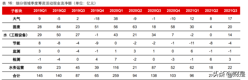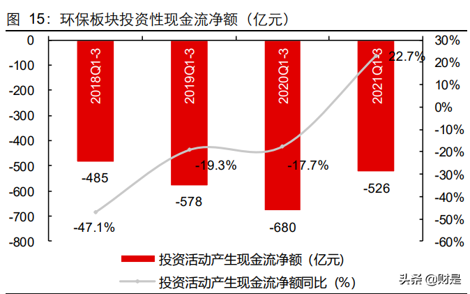 現(xiàn)金流量表:收入快速增長致收現(xiàn)比下行,投融資數(shù)據(jù)環(huán)比回暖2021Q1-Q3 環(huán)保板塊銷售商品收到現(xiàn)金/營收比率(收現(xiàn)比)為 87.7%,同比降 7.2pct,處于歷史數(shù)據(jù)區(qū)間內(nèi);經(jīng)營活動(dòng)、投資活動(dòng)及籌資活動(dòng)產(chǎn)生的現(xiàn)金流量凈額分別 151 億 元(去年同期為 206 億元,同比降 27%)、-526 億元(去年同期為-680億元,凈支出同 比減少 23%)和 197 億元(去年同期為 540 億元,同比降 64%)。收入快速上行致收現(xiàn)比下降,并非回款惡化。環(huán)保行業(yè)收入存在收款周期,而收入的快速上行致當(dāng)期收現(xiàn)比下降,并非行業(yè)回款惡化。行業(yè)經(jīng)歷過2018年 PPP 現(xiàn)金流風(fēng)險(xiǎn)后,各公司重視回款,推動(dòng) PPP 項(xiàng)目轉(zhuǎn)EPC模式,工程、設(shè)備銷售等業(yè)務(wù)控制客戶質(zhì)量,并強(qiáng)化前期應(yīng)收賬款回款等,使得行業(yè)現(xiàn)金流好轉(zhuǎn),結(jié)合前文對(duì)應(yīng)收賬款的討論,也可證明回款在向好。