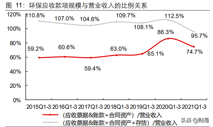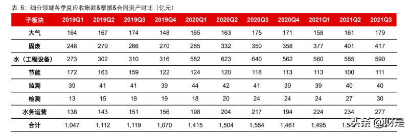 考慮到當(dāng)下部分公司將實(shí)質(zhì)的應(yīng)收賬款名義上放至存貨科目名下,故我們考慮存貨后, 2021Q3 末應(yīng)收賬款&票據(jù)+存貨+合同資產(chǎn)同比增 4.9%,(應(yīng)收賬款&票據(jù)+存貨+合同 資產(chǎn))/營業(yè)收入同比降16.8pct,變動(dòng)原因:1)水(工程設(shè)備)、節(jié)能、大氣的(應(yīng)收賬款&票據(jù)+存貨+合同資產(chǎn))絕對(duì)值有所下降,分別降 6.6%、6.4%、1.6%,強(qiáng)化了回款;2)各子行業(yè) 2021Q1-Q3 均獲得營收正增長,行業(yè)整體同比增 23.3%,特別是檢 測、水(工程設(shè)備)的同比增速在 30%以上。