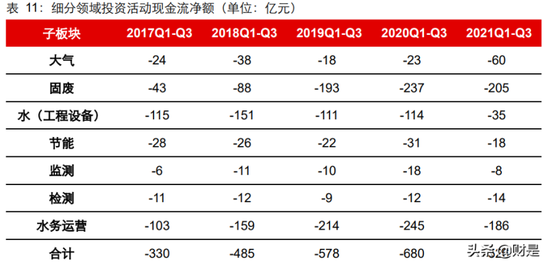 水務(wù)出現(xiàn)下行,主要是首創(chuàng)環(huán)保/中原環(huán)保/聯(lián)泰環(huán)保因業(yè)務(wù)需要,備貨增加,經(jīng)營活動(dòng)現(xiàn)金流出同比增加20.6/19.7/5.7億元,造成下行。2021Q1-Q3環(huán)保板塊投資活動(dòng)凈支出同比降 23%達(dá) 526 億元,主要是水(工程設(shè)備)方向的投資性凈支出大幅下降,2021Q1-Q3 的支出為 35 億元,遠(yuǎn)低于2020Q1-Q3 的 114 億元;而固廢、水務(wù)運(yùn)營板塊的投資活動(dòng)現(xiàn)金流凈支出分別達(dá)205/186億元,同比存在一定程度下降,但仍保持了相當(dāng)規(guī)模,與該兩個(gè)方向仍處于成長期有關(guān),預(yù)計(jì)資本開支的需求將維持;投資活動(dòng)現(xiàn)金流也反映了資金投向的項(xiàng)目整體質(zhì)量有所提升。