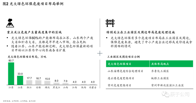 在危廢產(chǎn)量高的省份,頭部企業(yè)更是具有絕對(duì)優(yōu)勢(shì),例如光大綠色環(huán)保,一方面重點(diǎn)關(guān)注危廢產(chǎn)生量高度集中的區(qū)域,早早布局江蘇、山東兩個(gè)產(chǎn)廢大省和貯存大省,將其60%的產(chǎn)能都布局于此,兩省累計(jì)布局超過(guò)110萬(wàn)噸的產(chǎn)能,以此為基礎(chǔ),在江蘇、山東產(chǎn)能逐漸過(guò)剩時(shí),其最新的項(xiàng)目開始以江蘇為中心向東南各省擴(kuò)展;另一方面,他們也特別關(guān)注危廢產(chǎn)量高省份在工業(yè)園區(qū)及周邊布局危廢處理設(shè)施,擁有多個(gè)危廢項(xiàng)目布局在工業(yè)園區(qū)及周邊,保障危廢來(lái)源,避免了中小產(chǎn)廢企業(yè)遷移或關(guān)停造成拿料困難的情況(見圖2)。